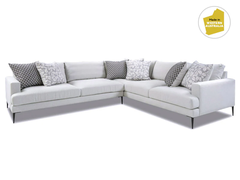 A modern look with beautiful cushioning, low back and black steel legs, Zara is a true modular and can be configured to your requirements. Pictured in the Warwick fabric Emir Alabaster. Zara has a solid timber frame in ply and structural Jarrah. Seat cushions are Dunlop stamina foam with fusion gel overlay. Scatter cushions are included 7 large back cushions and 4 small plain cushions, all in quality Warwick fabrics.